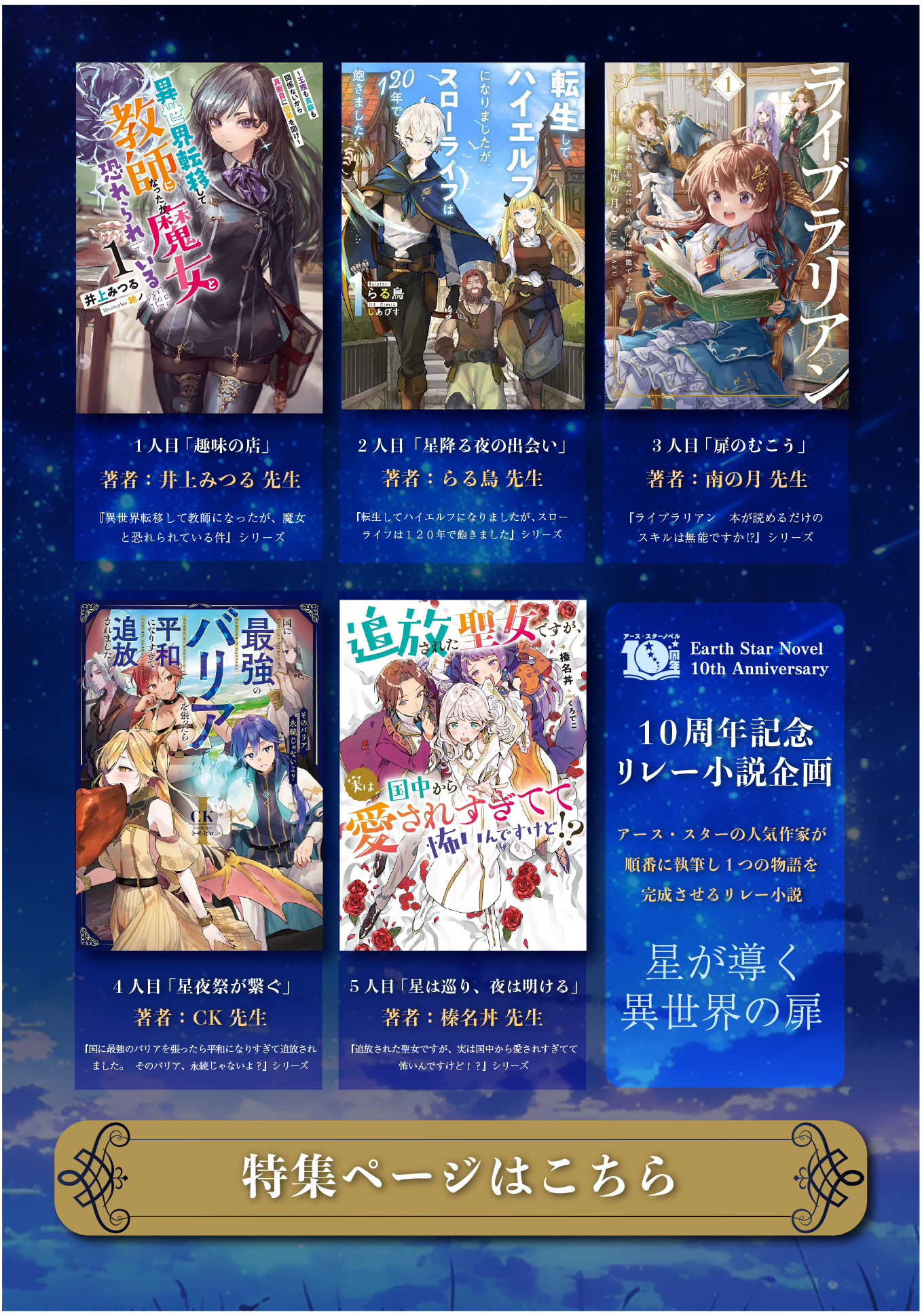 アース・スターノベルは2024年12月に創刊10周年を迎えました。これもひとえに応援下さったファンの皆様のおかげでございます!10周年企画の一環として、アース・スターの人気作家が順番に執筆し、一つの物語を完成させるリレー小説企画を実施。ぜひお楽しみいただければ幸いです!